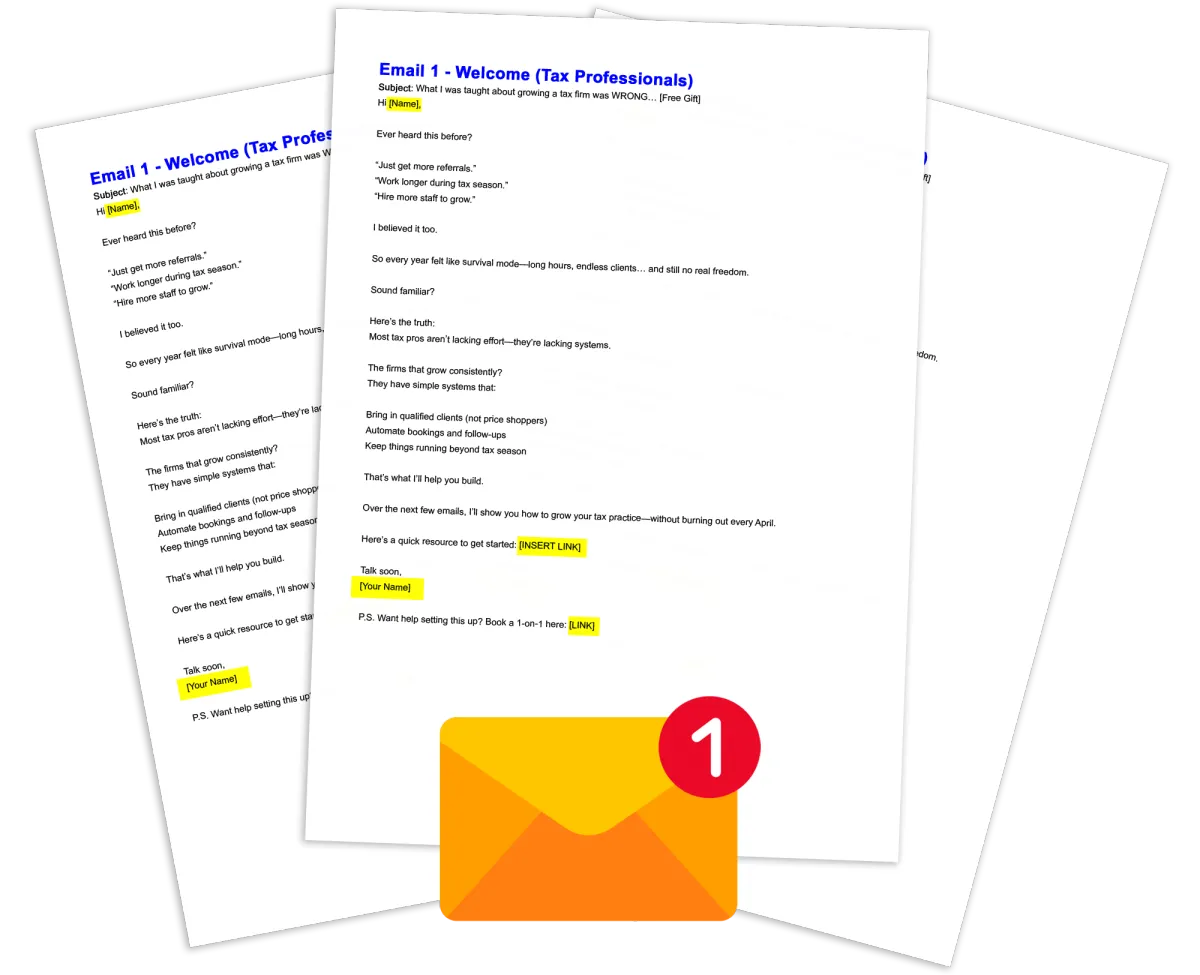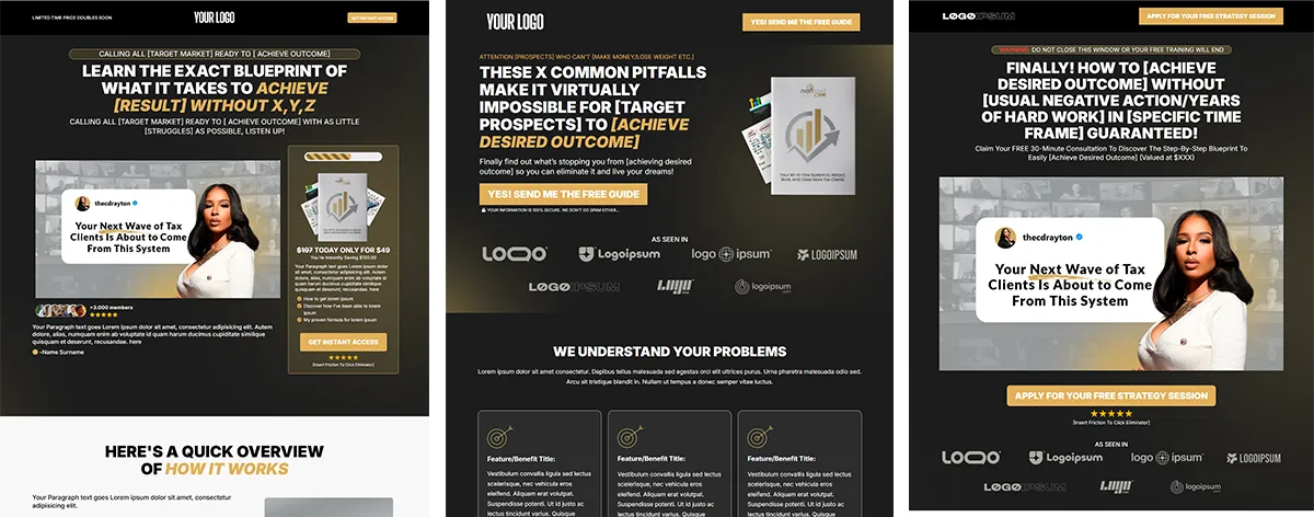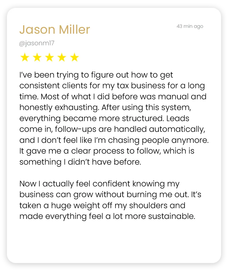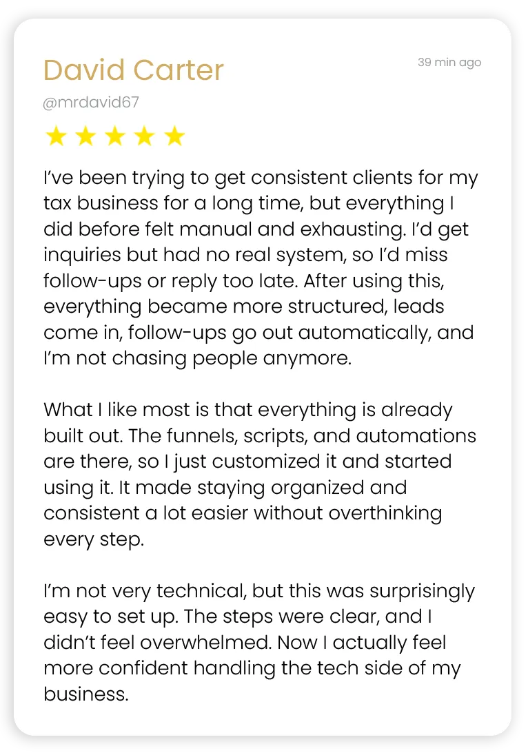 Capture and convert potential clients with a proven funnel designed to turn cold traffic into real inquiries. Stop relying on referrals and start building a steady pipeline of tax leads.